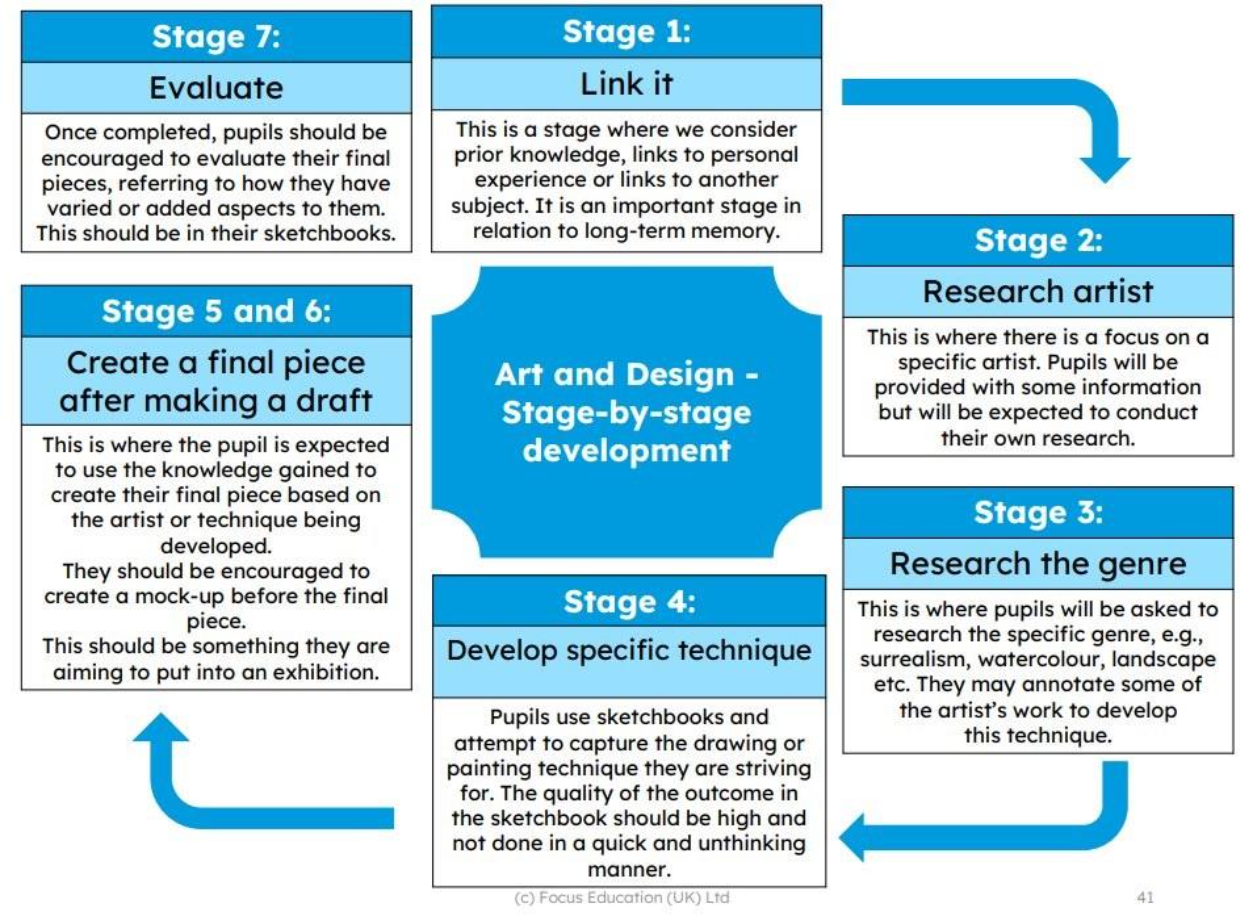 Using our sequence of learning (see below), Children develop practical skills and techniques in a wide array of disciplines such as drawing, painting, sculpture, collage and printing and these skills will be honed over the years through regular revisiting, building upon existing skills.