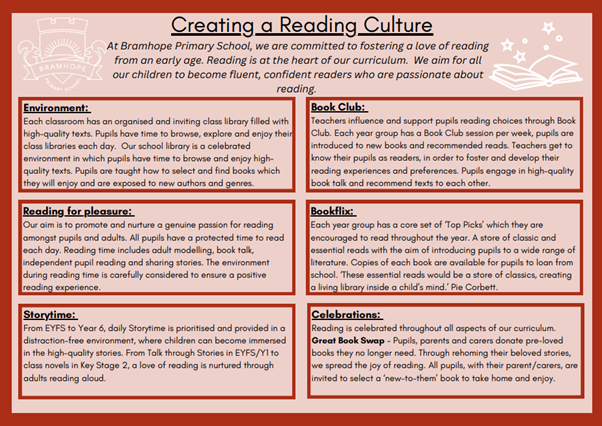 At Bramhope Primary School, we are committed to fostering a love of reading from an early age. We aim for all our children to become fluent, confident readers who are passionate about reading.